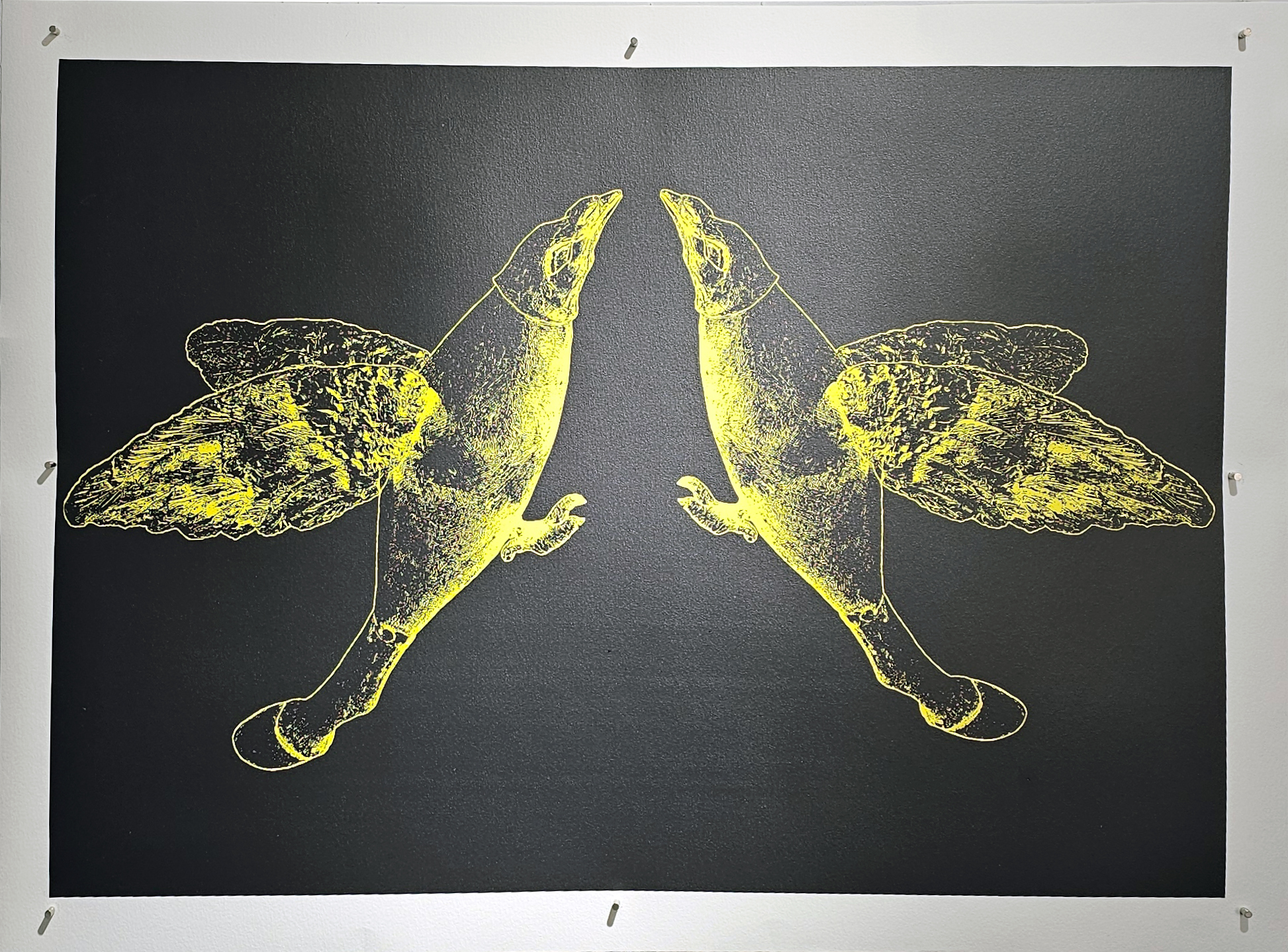 "Lines of Flight" is not just an exhibition; it is a confluence of Mahamid's prolonged exploration of the human condition through the lens of displacement and environmental dialogues. Inspired by Gilles Deleuze and Félix Guattari’s (1987) philosophical concept of ‘lines of flight’ the exhibition encapsulates how individuals and societies navigate out of social, political and physical territories of control, as well as dominant regimes of being and thought. In the exhibition Mahamid explores the metaphorical and literal odyssey of survival and adaptation, drawing inspiration from the remarkable navigational abilities of the nonhumans that are seen to mirror the struggles of the Palestinian populace (Mahamid 2024). Their journeys reflect the multifaceted strategies of the line of flight, which are not just acts of escapism but ‘transformative voyages akin to water flowing through cracks of oppression, disappearing towards a hopeful horizon’ (Mahamid 2024). On another level migratory lines of flight resonate with the ongoing and historical travails of Palestinians, navigating through a maze of borders, checkpoints, and obstacles in their perpetual pursuit of reclaiming their ancestral lands, embodying resilience and adaptability amidst socio-political upheavals (see Rijke and Minca 2018).