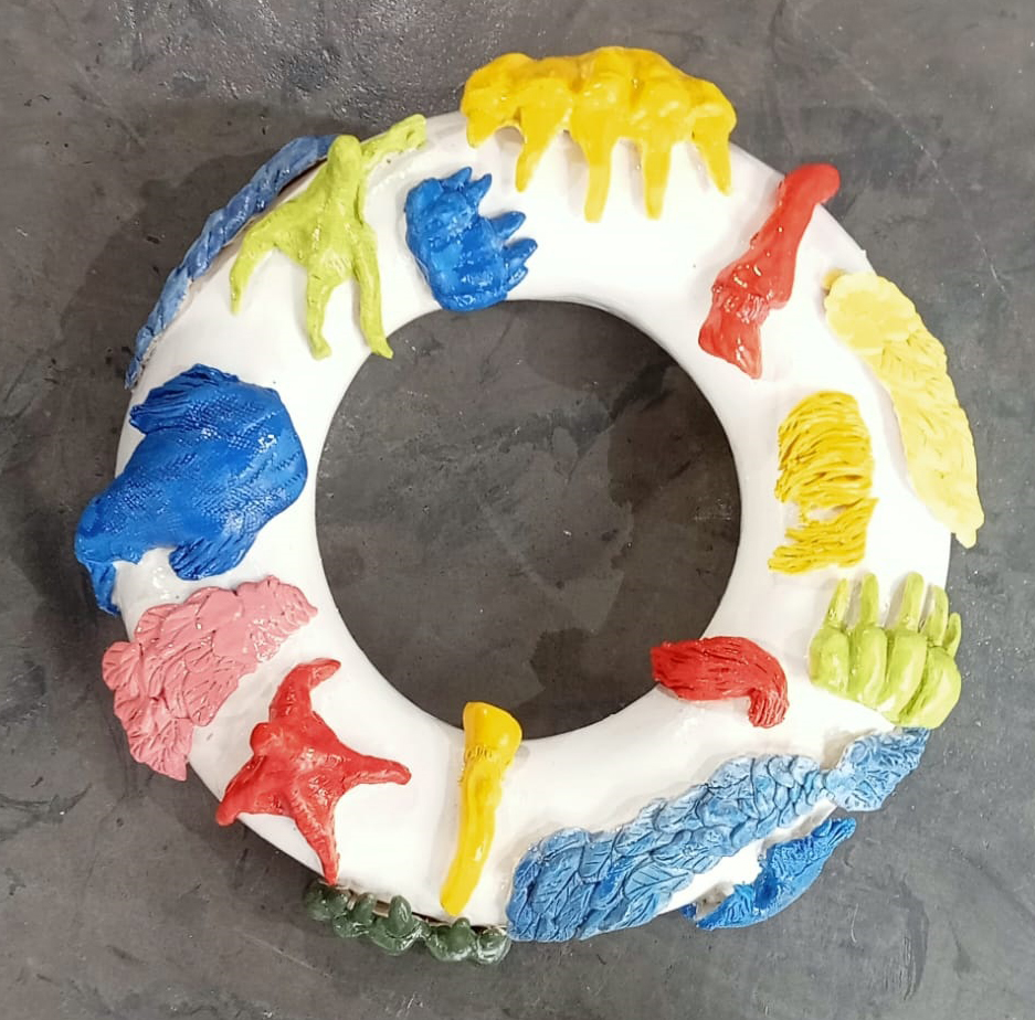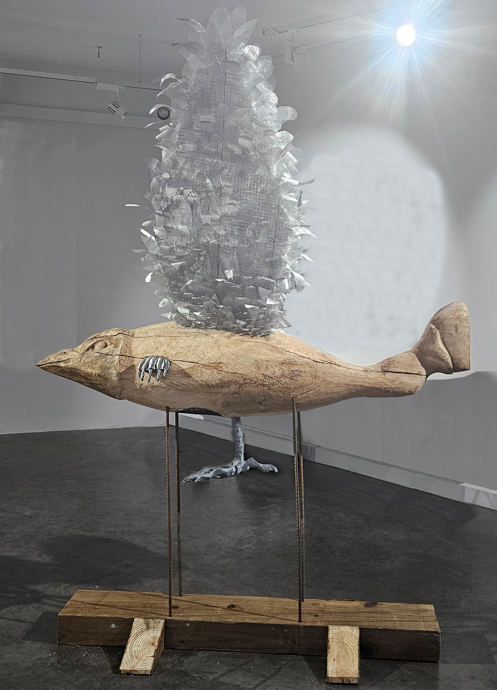 Central to the exhibition is a series of sculptures/installations drawing upon Mahamid’s Palestinian heritage and her reflections on global issues of migration and border politics. One such piece, depicts a blended hybrid creature that symbolizes various migratory instincts with the universal quest for a homeland (Quran, 2015). This piece not only challenges the viewer to reconsider the notion of borders but also pulsates with the current war in Gaza, highlighting the resilience of those navigating the harsh realities of displacement.