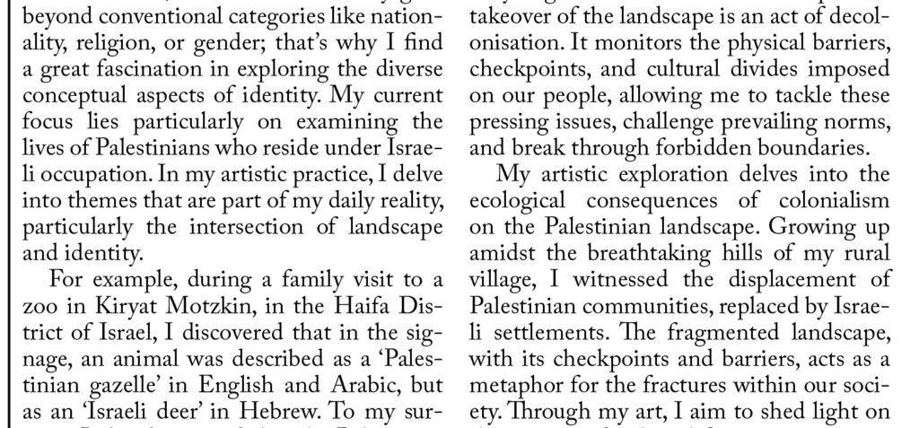 As an artist, I believe that identity goes beyond conventional categories like nationality, religion, or gender; that’s why I find a great fascination in exploring the diverse conceptual aspects of identity. My current focus lies particularly on examining the lives of Palestinians who reside under Israeli occupation. In my artistic practice, I delve into themes that are part of my daily reality,