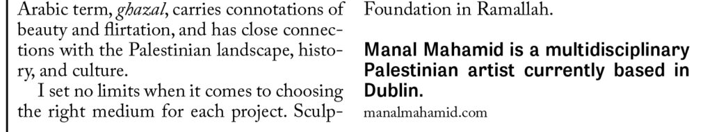 I set no limits when it comes to choosing the right medium for each project. Sculpture, video, installation, drawing, photography, printmaking, and collage are all essential artistic processes. However, moving image has emerged as a powerful medium for me in the Palestinian gazelle project, to